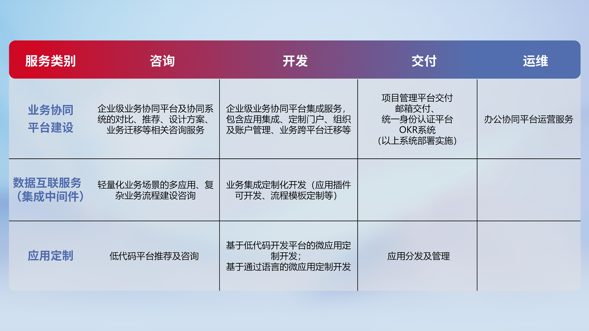 针对钉钉、、企微、、IDaas等平台级产品提供产品的规划、、、方案、、交付、、、定制化开发等服务,,实现如统一协同办公、、、、智能客户服务、、、、混合会议管理、、、智能数据查询、、、、等业务场景,,实现数字化转型。。。。